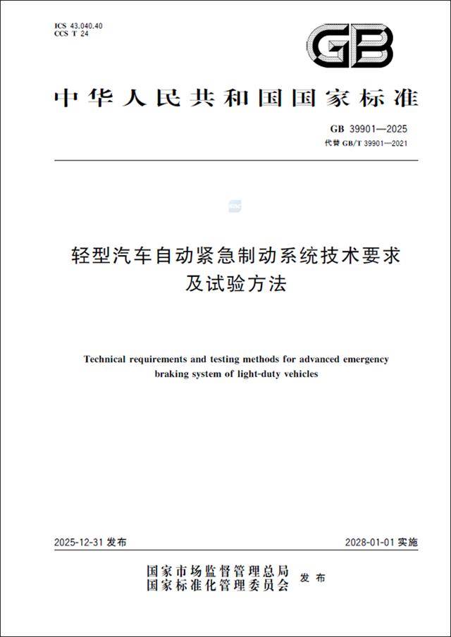 2025年12月31日,工业和信息化部组织修订的强制性国家标准《轻型汽车自动紧急制动系统技术要求及试验方法》(GB39901一2025),经国家市场监督管理总局、国家标准化管理委员会批准发布,将于2028年1月1日正式实施。该标准由推荐性国家标准GB/T39901一2021《乘用车(884099)自动紧急制动系统(AEBS)性能要求及试验方法》修订而来,是我国在汽车驾驶辅助系统领域的首个强制性国家标准,标志着轻型汽车自动紧急制动系统将从“选配”走向“标配”,并具备统一、规范的安全性能基准。