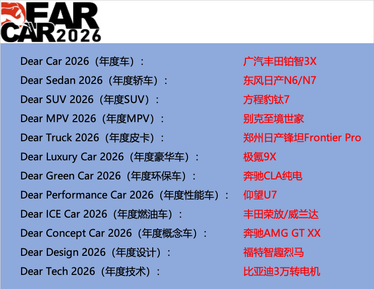 当时间的指针拨向2025年,汽车行业的竞赛主题已悄然从单一技术的“突破”,转变为创新科技的“普及”与“融合”。今年“Dear Car 2026”的获奖名单,正是这一趋势最生动的注脚。真正的行业引领者,不再是炫技的孤勇者,而是那些能将最前沿的技术思考,转化为深受市场认可的产品体验的实干家。